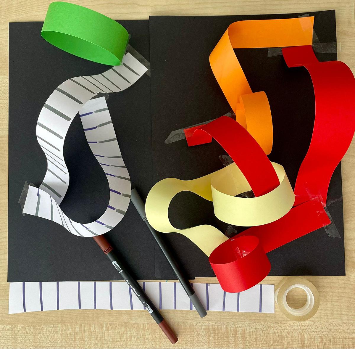 - You could also add pieces of cardboard tubes and experiment with different ways to lift the paper strips off the card to create bigger loops, twists and turns
